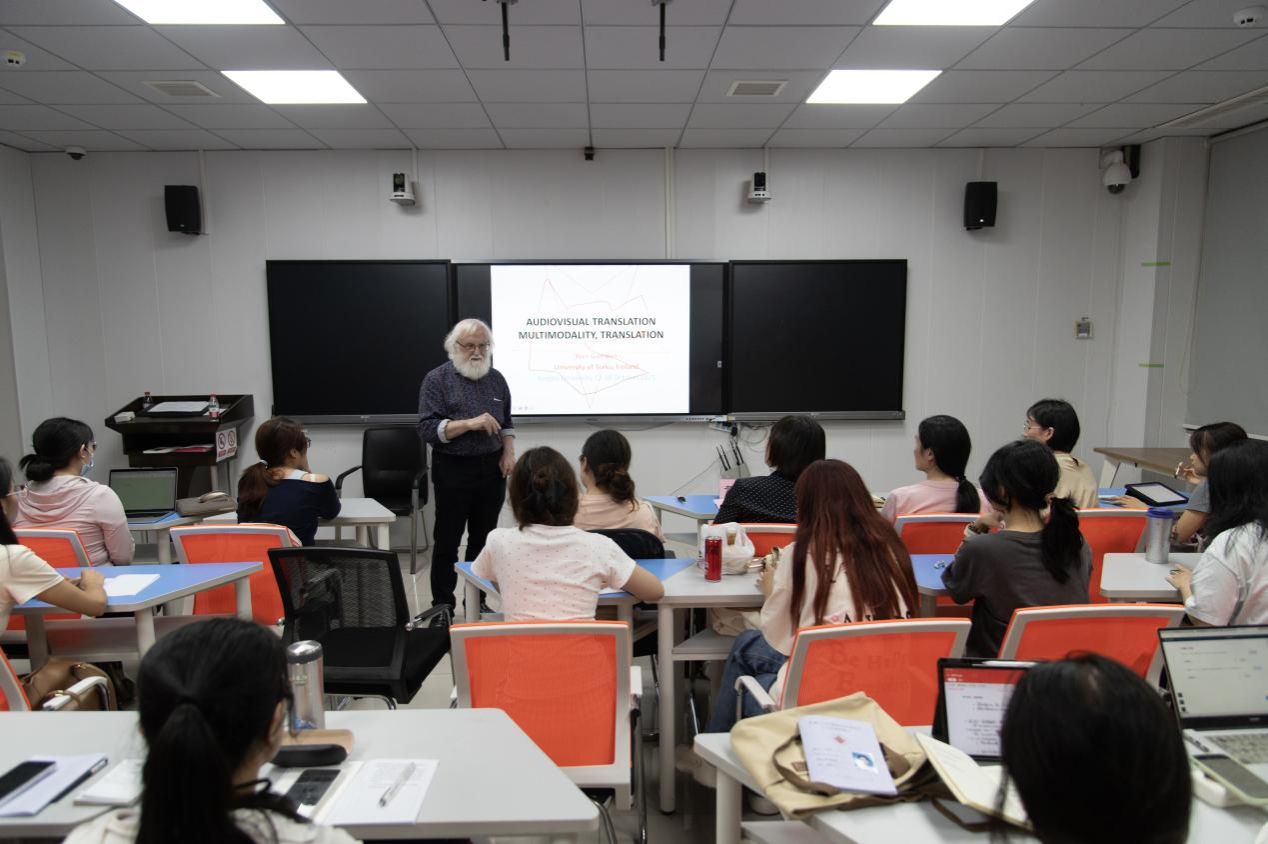 当晚举行的“李达三讲堂第一百讲”聚焦“翻译、视听翻译与多模态研究”。Gambier教授开宗明义指出:“在数字化传播生态中,多模态是常态,而非特例”。通过字幕翻译、游戏本地化等典型案例,他系统阐释翻译研究正历经从“对等”走向“文化”、从“纸质书籍”走向“数字媒介”的范式转型,并详细梳理了模态内、媒介间等多元翻译路径。他强调多模态翻译的兴起对译者能力提出更高要求,译者需整合语言、图像、声音等符号资源,兼备跨文化交际与技术应用素养,为学院MTI实践教育标定了前沿方向。