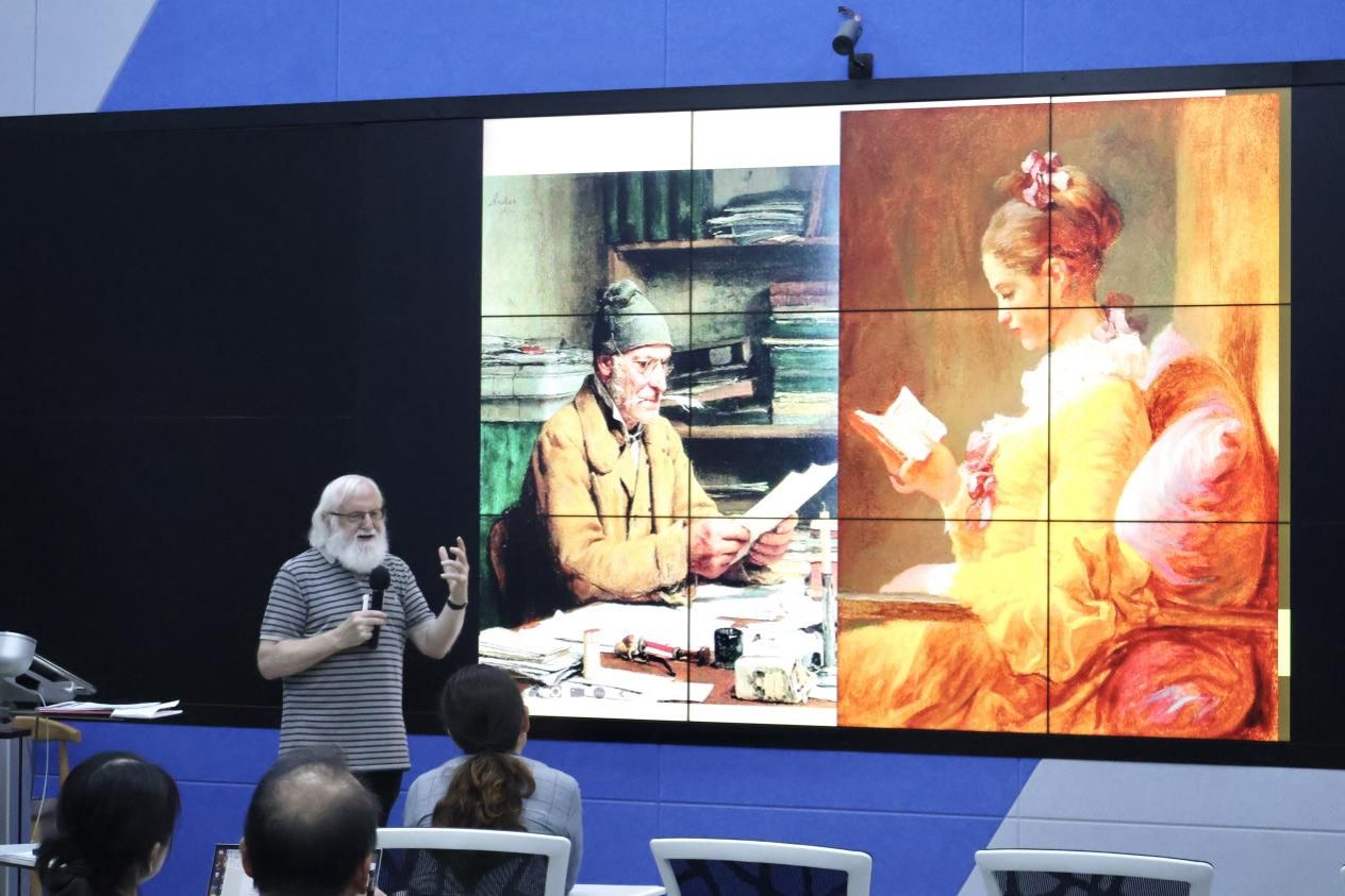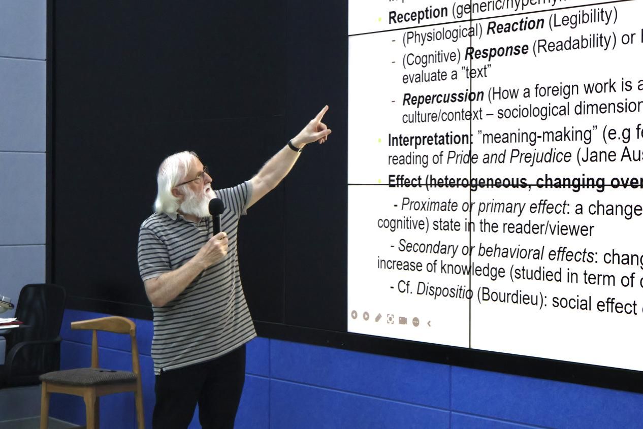 10月14日第二场讲座《翻译研究中的接受》(Reception in Translation Studies)由张陟教授主持。Gambier教授聚焦翻译研究中的“接受”维度,以深入浅出的方式阐明翻译文本如何在读者与社会的互动中被理解与赋予意义。他指出译者并非意义的唯一建构者,文本意义生成于读者与文本的动态交互过程。通过解构社会学视角的“社会效应”及认知-文本学视角的“即时反应”与“理解回应”,他构建了清晰的翻译接受研究三维框架。