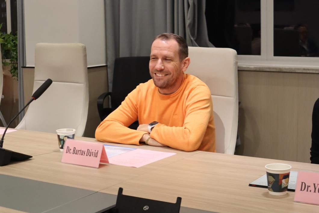 会谈中,罗兰大学文学院院长 Bartus Dávid博士详细介绍了罗兰大学的悠久历史,并重点阐述了其人文学院作为该校第一大学院的显著地位与学科优势。他特别分享了学院在语言学科、人文学科领域的设置,以及这些学科与人工智能、商贸企业融合发展的创新实践。其中,罗兰大学新近开设的“跨文化商务交际”硕士项目引起了与会者的浓厚兴趣。David院长指出,该专业深度融合语言学科与商学学科,旨在培养适应全球化商贸需求的复合型人才,不仅在匈牙利本土发展态势良好,也正积极寻求与海外高校的合作机遇。这一合作方向与91porny