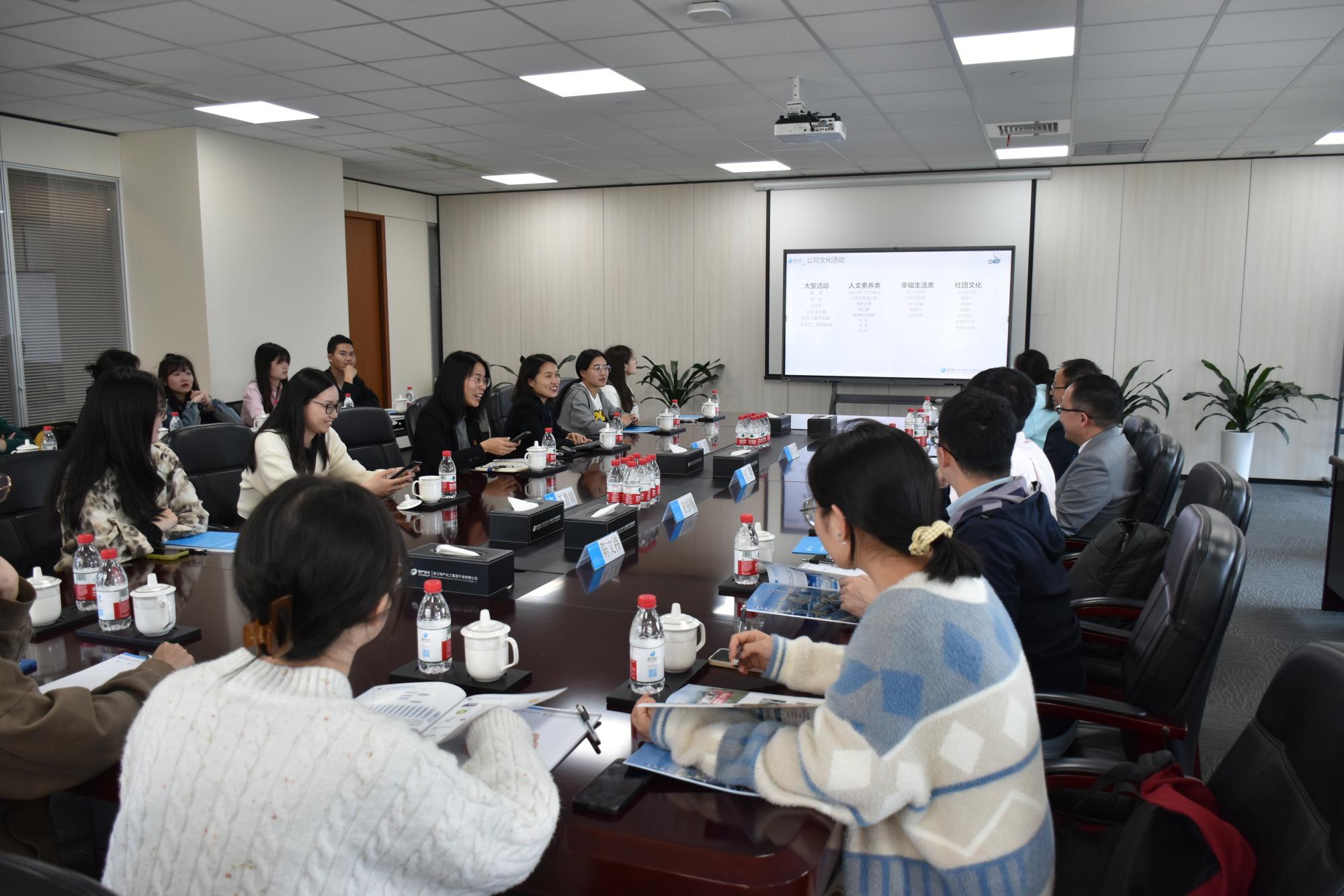 学院师生与公司代表在会议室举行座谈,张晨详细介绍了公司的发展历程、公司定位、发展战略方向以及91porny,并介绍了当前在公司任职的杰出校友。高春燕从自身经历出发,分享了外语专业毕业生在公司的发展历程,阐释了对“实事求是、经世致用”的校训和“做人、做事、做学问”的深度理解,她也结合公司发展理念,希望同学们在大学学习期间应该保持对生活的热爱,在保证身体健康的同时提高自身的学习能力和综合素养。随后,副院长张陟向与会代表介绍了91porny