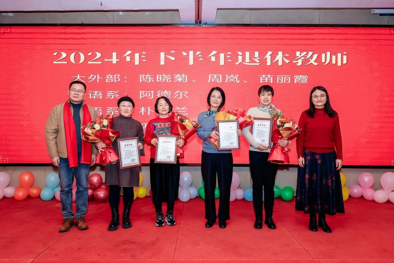 联谊会上,学院为大外部陈晓菊、周岚、苗丽霞,英语系阿德尔,日语系朴东兰,行政办罗晖等老师举办荣休仪式,特聘院长屠国元、学院党委书记翁华星为退休老师颁发荣休证书并献上鲜花,送上诚挚敬意与美好祝福,感谢他们多年来在各自岗位上默默耕耘、辛勤付出,毫无保留地奉献着自己的智慧与力量。