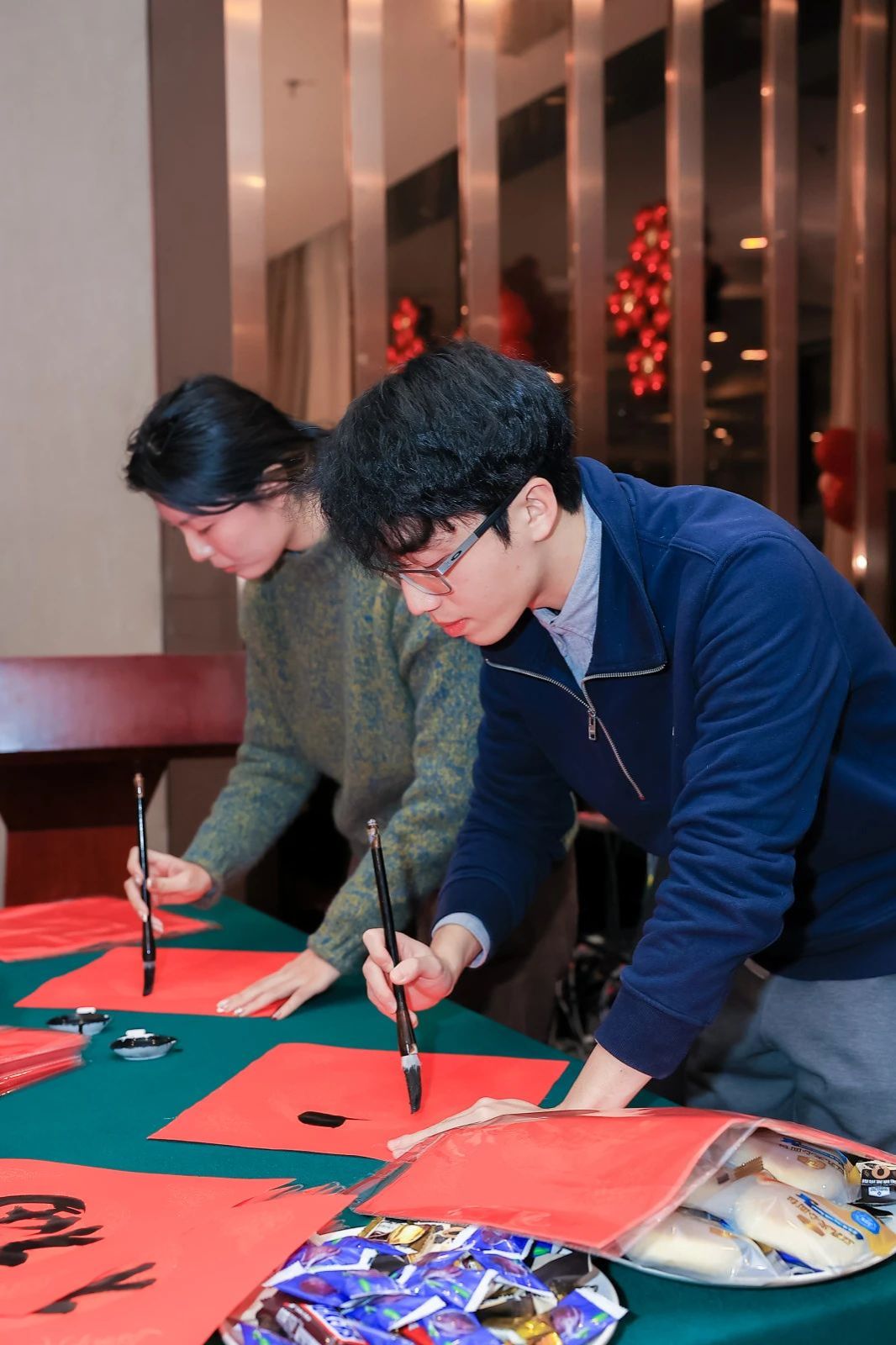 联谊会节目精彩纷呈,学院师生、校友带来歌舞、小提琴演奏、诗歌朗诵等多种形式的表演。全体党政班子成员首次携手登台,用他们饱含深情与力量的嗓音,共同演绎了歌曲《我们都是追梦人》。研究生施周安健与本科生朱奕恬受邀来到现场挥毫泼墨,书写了百余张福字,吸引了老师们围观欣赏,学院领导们满载深情厚谊,将福字送到每位老师和校友的手中。