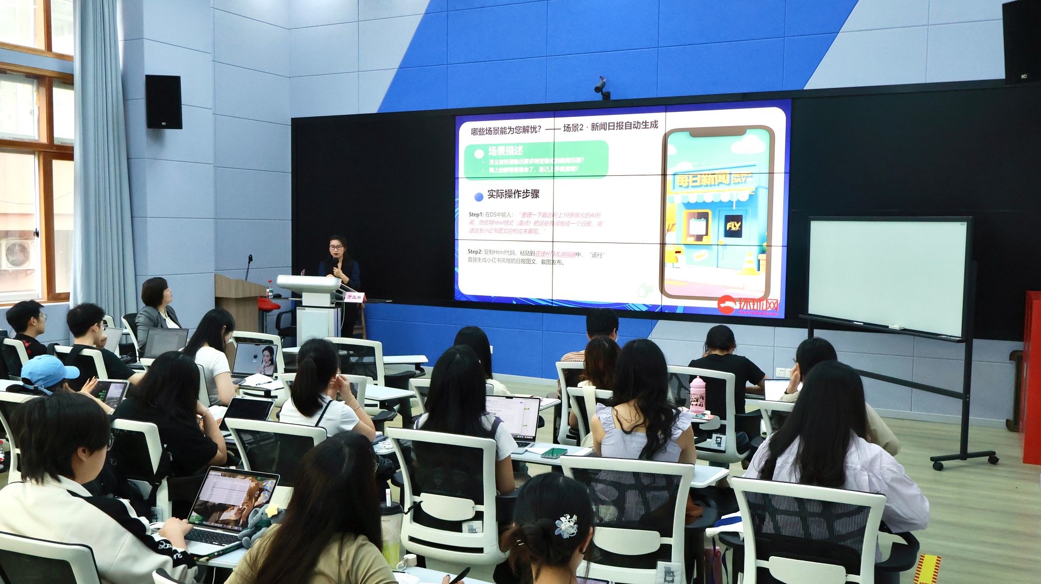 此外,方亚林老师现场推出了“AI后备军团”实践计划,鼓励学生通过多语言海报设计、动态视频制作等实战任务,掌握智能传播技术。这一计划与网络新闻编译课程的“任务驱动+项目导向”教学模式相契合,进一步增强了学生的实战能力和技术应用能力。