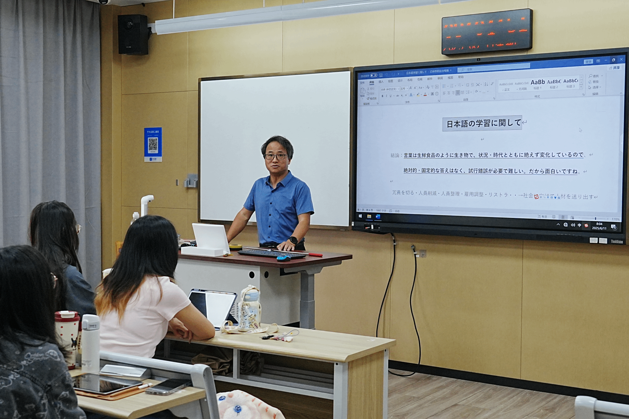 讲座伊始,马光超老师结合自身的丰富从业经历,分享了日语学习的方法与技巧。他强调,语言学习需要持之以恒地积累和实践,特别是在听、说、读、写四个方面均衡发展。马老师还通过生动的案例,向同学们展示了如何在实际翻译中灵活运用语言知识,避免机械直译,注重文化差异的转换。他特别指出,翻译不仅是语言的转换,更是文化的传递,鼓励同学们在日语学习中多接触日本文化,提升跨文化交际能力。