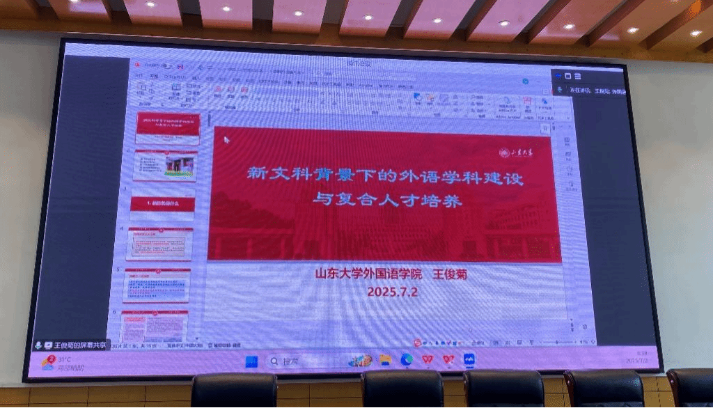 近年来在跨学科研究、人才培养模式创新等领域成果斐然。报告中,王俊菊教授立足新文科建设的时代命题,结合自身丰富的理论研究与实践经验,深入探讨外语学科发展与教育改革路径。王俊菊教授着重介绍了山东大学复合型外语专业建设中的新思路与新模式,对91porny