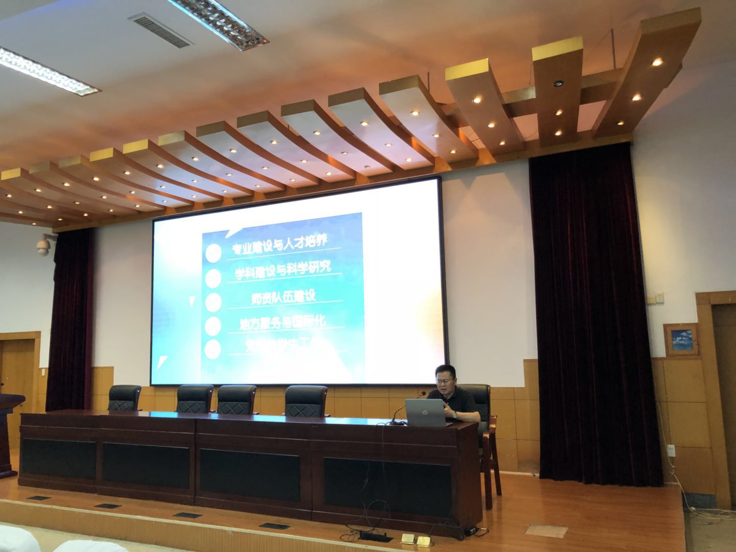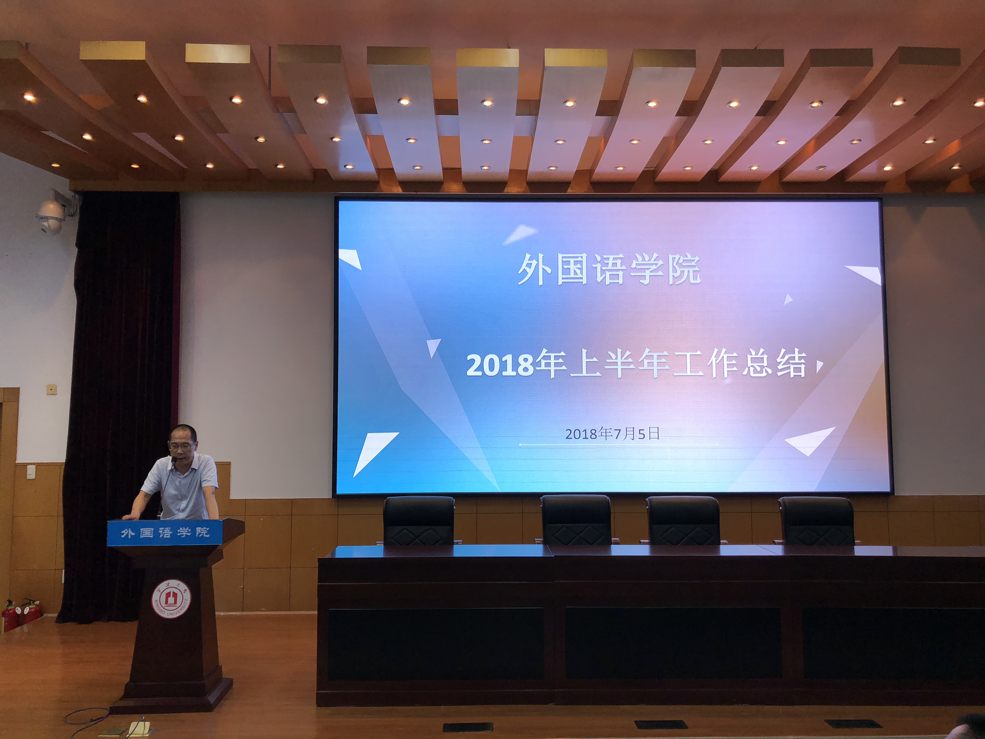 院长屠国元就本学期学院工作从专业建设与人才培养、学科建设与科学研究、师资队伍建设、地方服务与国际化工作、党建与学生工作五个方面做了总结。值得一提的是,学院英语专业首次进入五星专业,在全国744所高校中排名第43位,百分比为5.78%。英语专四、专八通过率较全国高出47.8个百分点,较综合性大学高出31.05个百分点。学院获批国家社科基金项目1项,教育部项目2项。外国语言文学学科全国排名21位(21/223),百分比为9.4%,继续稳居浙江省省属高校第1位。翻译硕士学位点全国排名17位(17/205),百分比为8.29%。工作总结后,院长代表院党政班子对全院教职工2018年上半年的辛勤工作表示感谢,也希望教职工在暑假期间劳逸结合,锻炼好身体,同时利用假期充实自己。