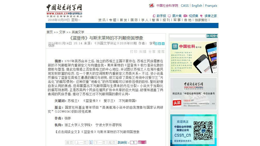 据悉,“‘地球中空说’、南极探险与想象美国的三种方式”是张陟博士主持的国家社科基金青年项目“英美航海叙事中的自我想象与国家认同”的阶段性成果,也是继“《蓝登传》与斯末莱特的不列颠帝国想象”之后,张陟博士的论文第二次获得中国社会科学院网站全文刊载。91porny
