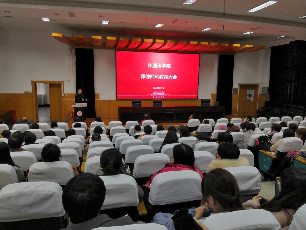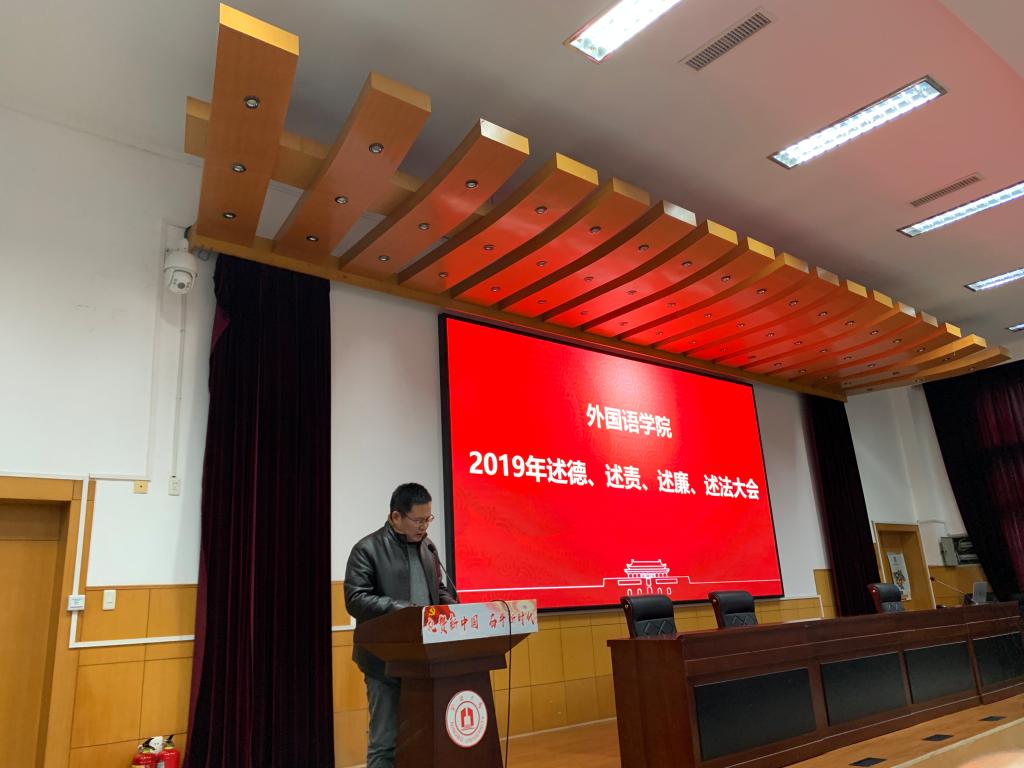 2019年度院领导班子述德述责述廉述法大会在李达三外语楼218报告厅召开,大会由党委书记方晓春主持,学院全体教职工参加。