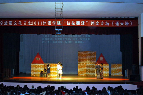 5月17日晚6点半,宁波帮文化节之2011外语学院外文专场《通天塔》在林杏琴会堂圆满落幕。校党委宣传部、校团委及学生处的领导,外语学院院长及党委领导,浙江大学宁波理工学院及本校其他学院分团委学生会代表,和广大师生齐聚一堂,观看了此次演出。