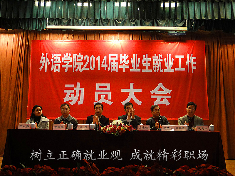 2014届毕业生就业工作动员大会在锦绣小剧场顺利召开。此次大会主题为“树立正确就业观,成就精彩职场路”。会议由院党委书记戚锦阳主持,校学工部副部长俞金波、院长卢植、院党委副书记倪志华、副院长于善志、王红阳、各系主任、班主任、辅导员出席会议,91porny