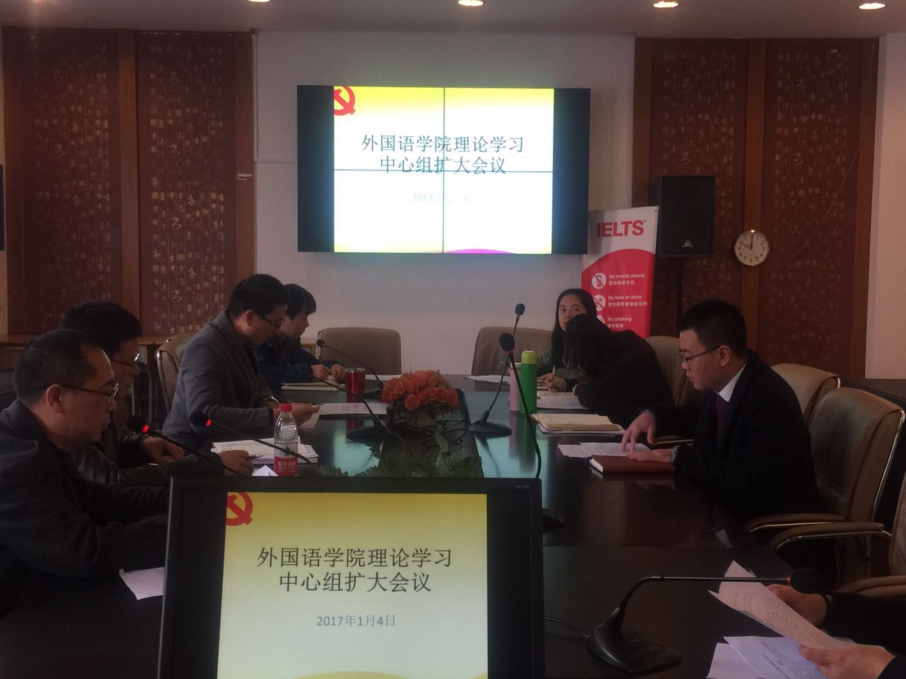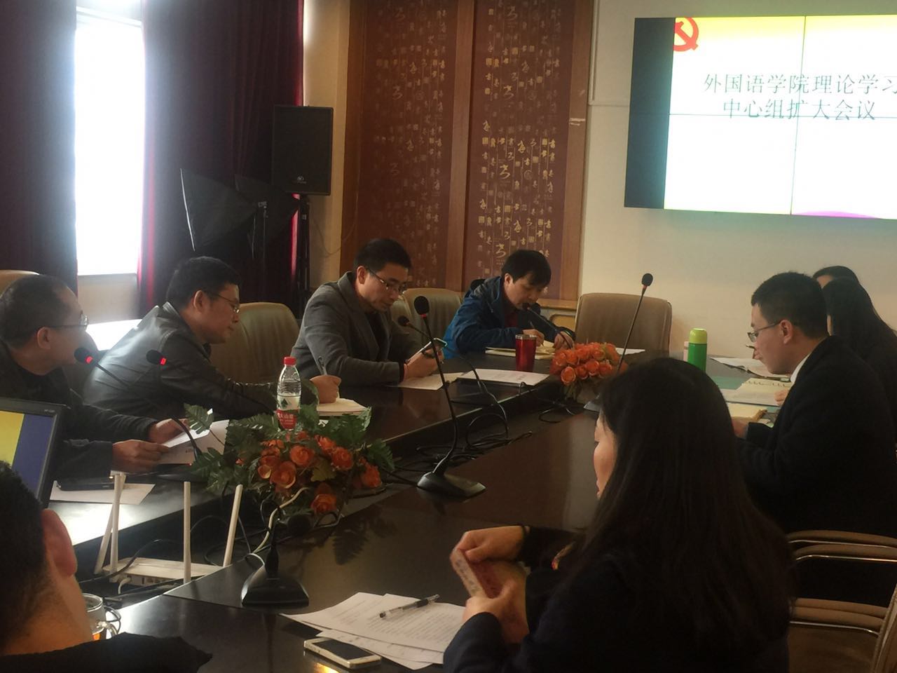 党委在外语楼422会议室组织召开理论学习中心组扩大会议。学院党委书记段汉武、院长屠国元及各教工支部书记、全体辅导员参与学习。