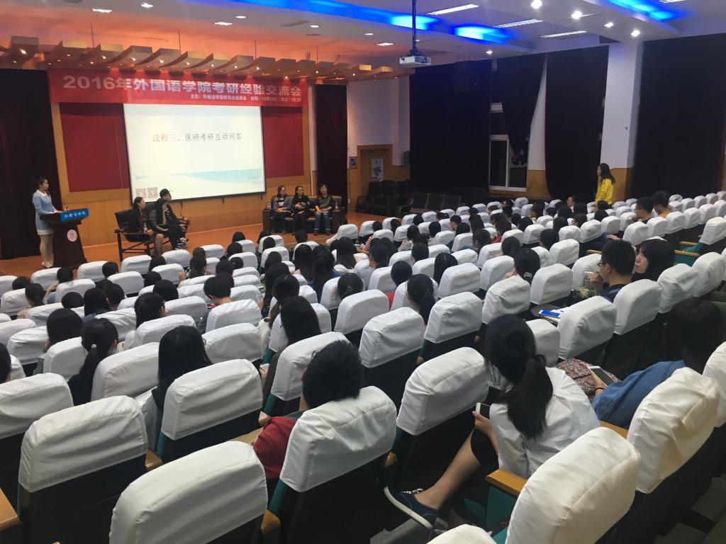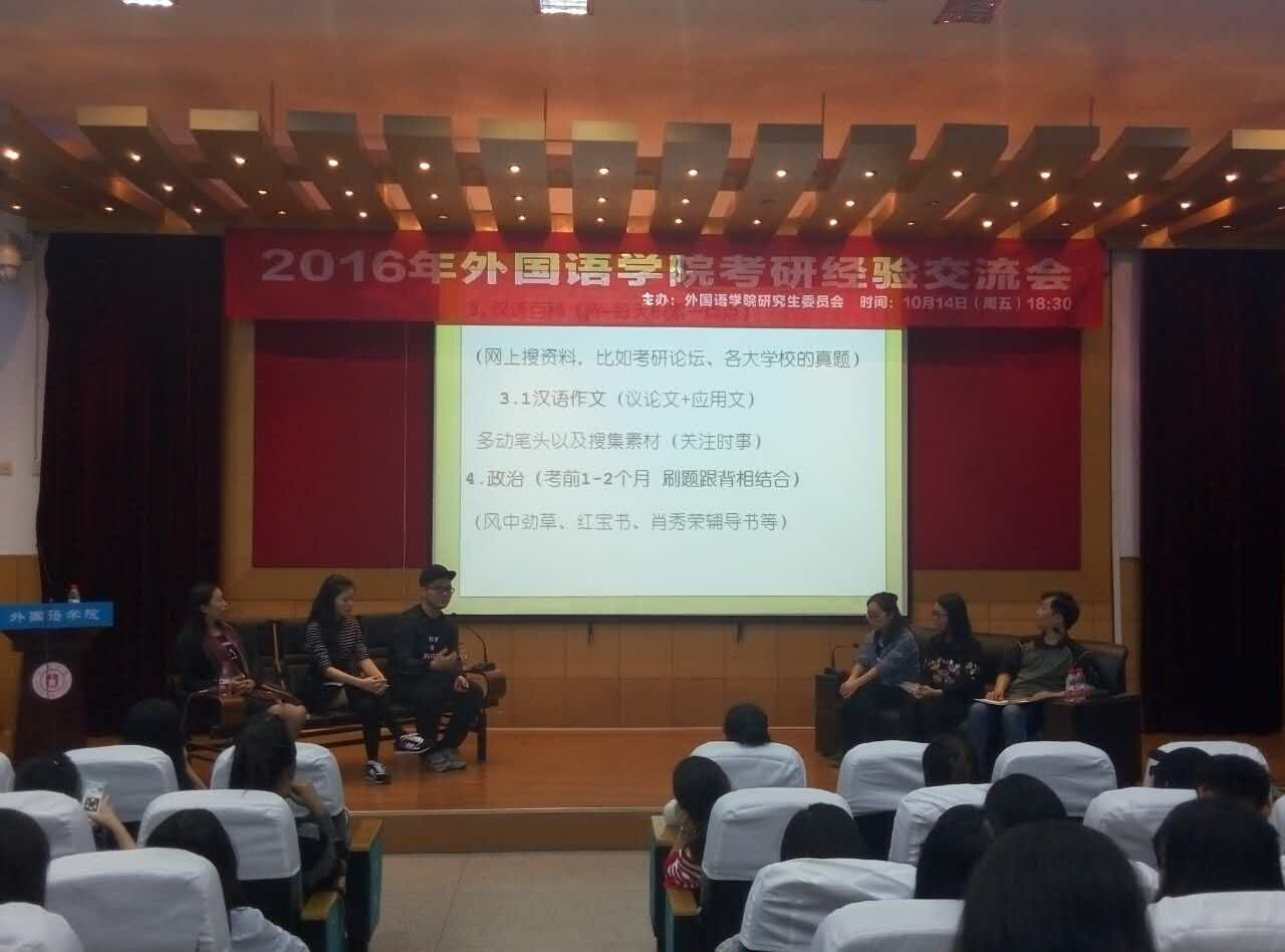 在外语楼218报告厅举办2016年“研续青春,共话未来”考研经验交流会。学院分管研究生工作副院长辛红娟、优秀研究生导师黄大网、2015年考入上海外国语大学笔译专业研究生马清清、2016年保研被上海外国语口译专业录取研究生张彩虹、2016年保研被华东师范大学学科教学专业研究生朱陈静和91porny