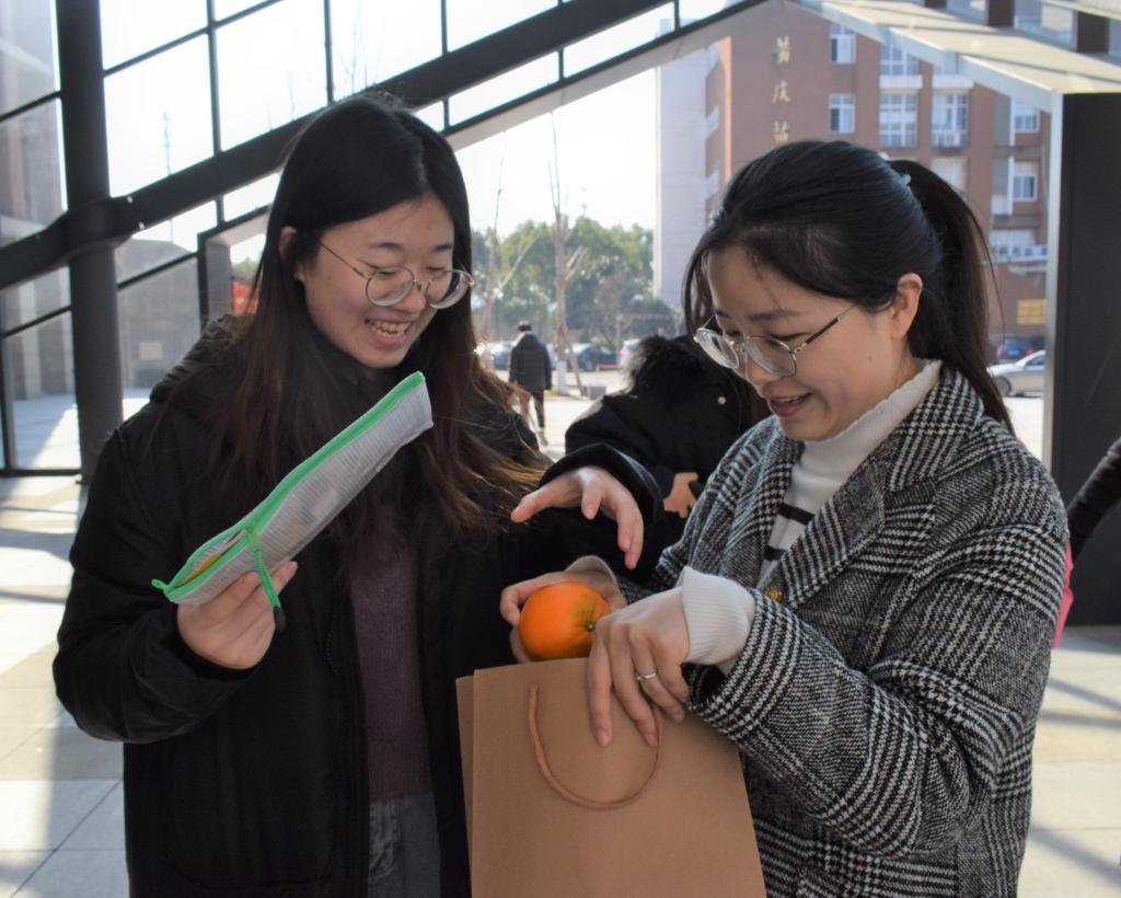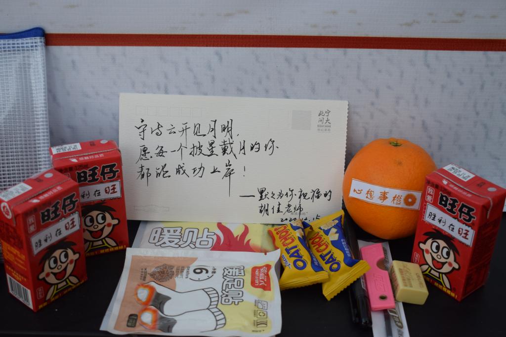 考研学子献上温情满满的“加油大礼包”,内含涂卡笔、笔芯、橡皮、小刀、暖宝宝等学习生活用品,还有寓意心想事成、胜利在望的橙子和旺仔牛奶。一份份精心准备的礼品,饱含着学院师生的诚意和殷切祝愿,鼓励考研人在冲刺阶段积极准备、坚定信心、坚持到底。随大礼包送上的还有由学院领导、任课老师、辅导员们亲手书写的卡片,笔墨间传达是老师们贴心的嘱托和精神支持,让考研学子真切感受到全院师生作为他们坚实后盾的强大力量。活动现场气氛融洽,同学们收到这些礼物,十分惊喜,纷纷表示感谢学院师生的暖心陪伴。