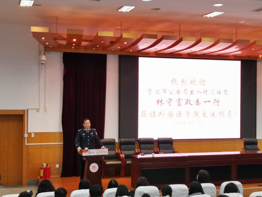 林政委首先介绍了出入境管理局的工作职责和素质要求,讲述了出入境管理一线的故事,特别分享了市局在此次新冠肺炎疫情期间发挥中坚力量、严守边境关的抗疫故事。作为外院校友,他还与同学们交流了大学毕业后如何从外语人成长跨界为出入境管理专家的个人经历,鼓励外语专业学生胸怀梦想、积极实践、做国家的有用之人和社会的有心之人,希望大家在外语学习、对外传播及外事实践中树立家国情怀、开拓国际视野、常抱敬畏之心、培养安全意识。在讲座的最后,他还向在场同学提出“新时代应该有怎样的梦想和期待?”“大学生应当如何更好地与社会接轨?”这两个问题,启发同学们思考。林政委以其生动的语言、丰富的内容和深刻的内涵,让在场师生备受教育、启发和鼓舞。