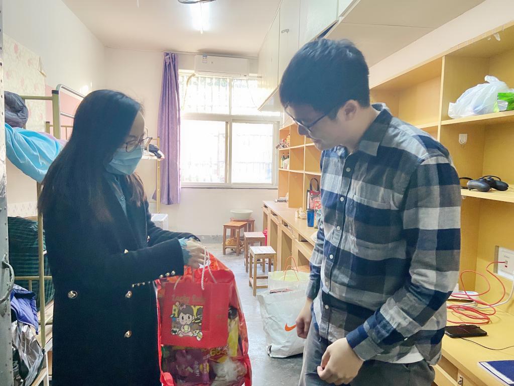 留校生们就收到了来自学院的花式慰问,学院党委副书记胡佳与辅导员林晓莉一起来到寝室走访看望留校的12名同学,并为他们送上了口罩、消毒洗手液、零食大礼包等慰问品。“这个春节,虽然不能回乡与家人团聚,但是在学校的我们就是温暖的一家人。”