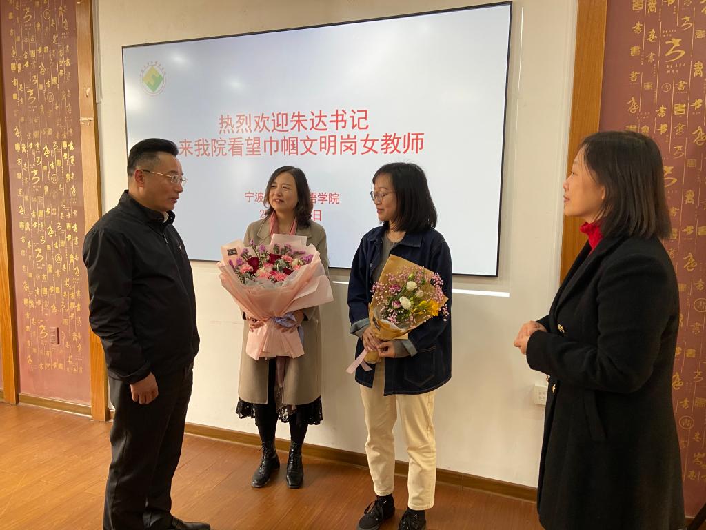 在第98个国际妇女节到来之际,3月8日下午,校党委书记朱达,副校长赵全军,党委委员、工会主席邹日强一行来到全国“巾帼文明岗”所在单位——91porny 大外部,向女教师们送来节日问候。91porny 负责人介绍了大外部团队基本情况,大外部现有教师49位,其中女性教师41位,是名副其实的巾帼建功单位。