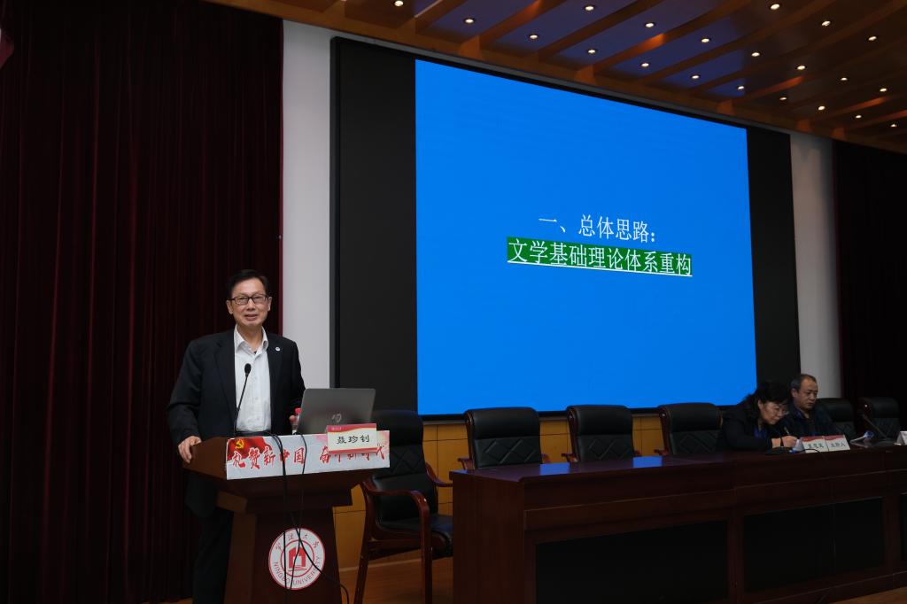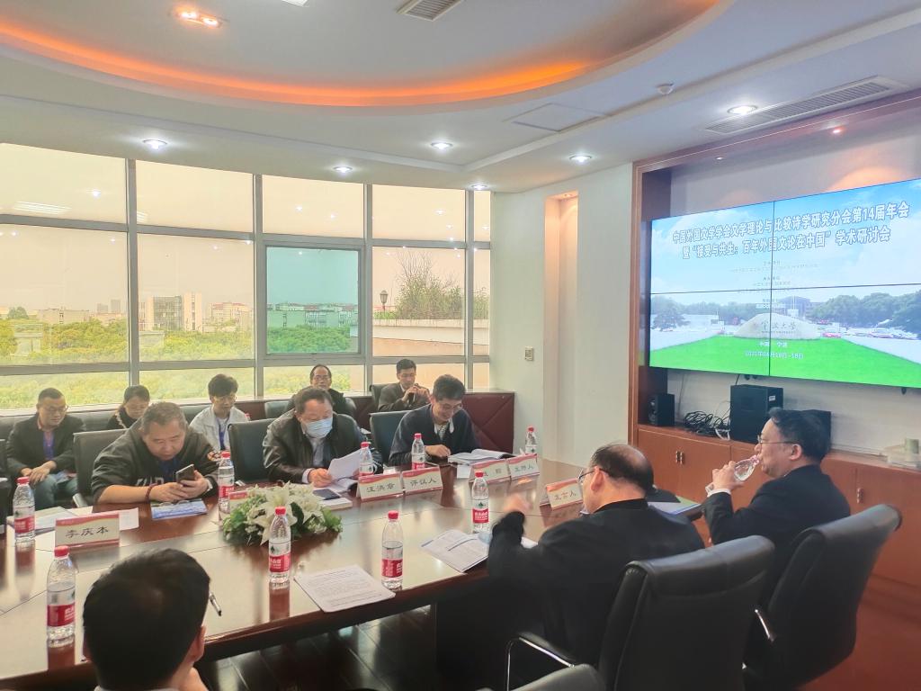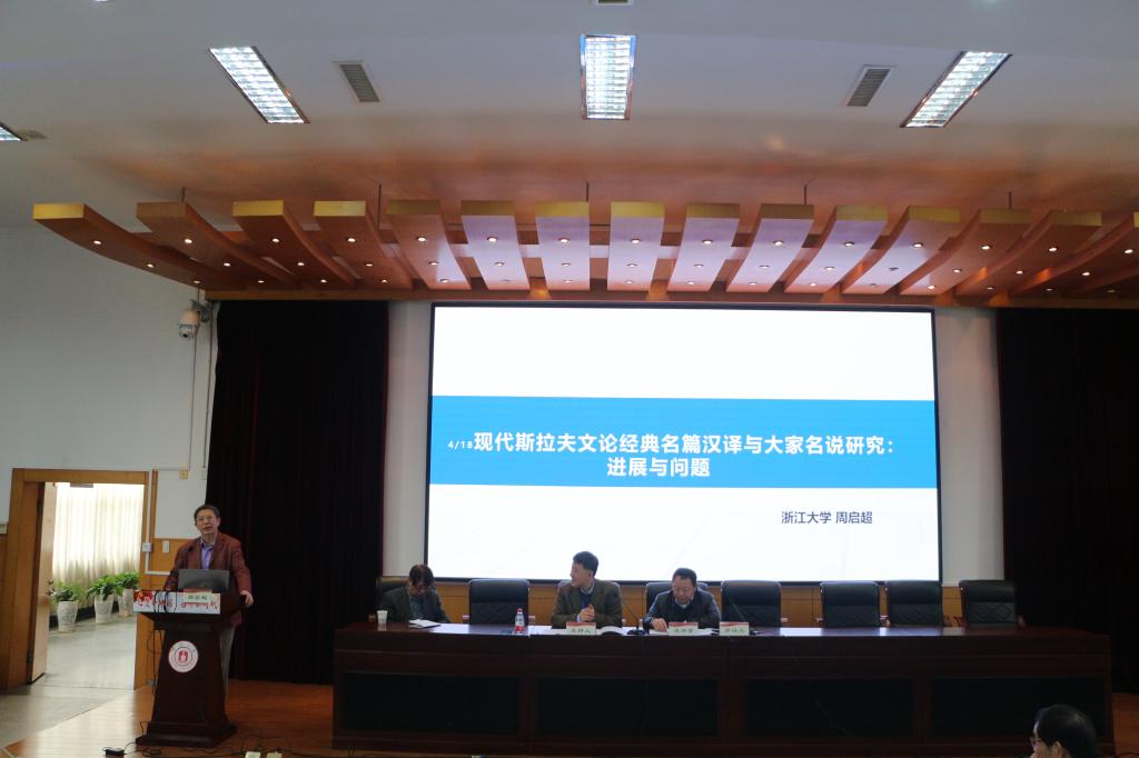 会议期间,专家们进行了14场大会报告。在4月17日上午的主会场有6场大会报告。中国人民大学耿幼壮教授做了“关于外国文论译介与研究的几个问题”的发言,就外国文论在中国接受过程中的内涵演变与发展倾向及其与中国元素的互动与融合进行了深入的阐述。浙江大学周启超教授介绍了国家社科基金重大项目“现代斯拉夫文论经典名篇汉译与大家名说研究”的进展与问题,展示了课题组阶段性研究成果,认为雅各布森百年前提出的“文学性”在文学研究中具有话语史、学术史、思想史价值,在今天的世界文学与比较文学研究实践中还有现实意义,强调外国文论引介要超越“粗放”,进入“深耕”。 北京外国语大学马海良教授在“西方文论的真理话语系统”的报告中,认为真理话语是西方文论的主导范式,广泛渗入文艺创作实践,而后现代文论实则上是对真理话语传统的反噬。浙江工商大学蒋承勇教授作了“‘现实’与‘浪漫’:矛盾中的‘勾连’”的演讲,就现实主义与浪漫主义的关系进行了深入的考辩,认为坚持现实主义本原性特质研究可为建构有中国特色的外国文学和文学理论学科体系、学术体系和话语体系提供支撑与支持。复旦大学汪洪章教授做了“关于中西形式论话语的一点比较”的报告,认为关于文学作品首尾圆合、有机一体的论述在中西文论史上历来有之,并以《文心雕龙》为例,与西方文论家的相关论述进行了比较探讨。上海大学曹谦副教授在“苏联审美学派及其争论与1980 年代中国文艺本质的讨论”的报告中,认为上世纪八十年代苏联美学和文论特别是苏联“审美学派”及其争论的译介研究与我国当代文论转型发展构成了相互促进的互动关系。兰州大学朱刚教授作了题为“理论可以‘旅行’吗?”发言,就赛义德的“Traveling Theory”(一般译为“旅行理论”)的准确译法从词源上做了解析,认为“Traveling ”应该译为“飘移”更为贴切,因为“飘移”本身所含的播撒性、互动性、地域性和批判性都与赛氏的后殖民理论相契合。