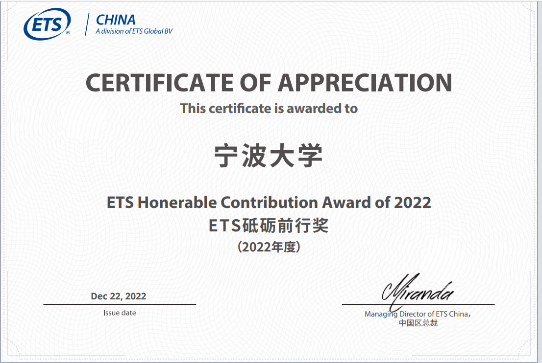 托福/GRE考点荣获该中心授予的全国考点“2022年度砥砺前行奖”荣誉称号。