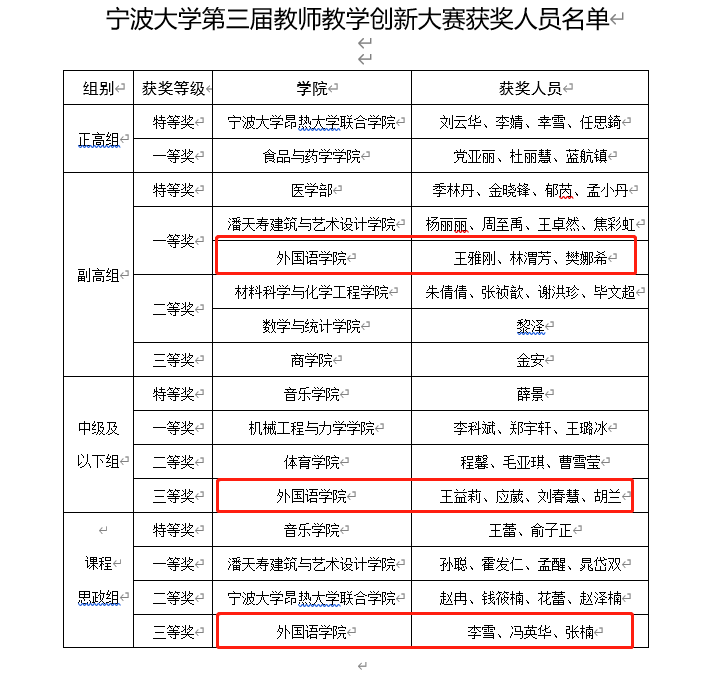 王雅刚、林渭芳、樊娜希老师(“综合英语1”课程组团队)荣获新文科副高组一等奖;王益莉、应葳、刘春慧、胡兰老师(“大学英语四”课程组团队)荣获新文科中级及以下组三等奖;李雪、冯英华、张楠老师(“中日比较文学”课程组团队)荣获课程思政组三等奖。