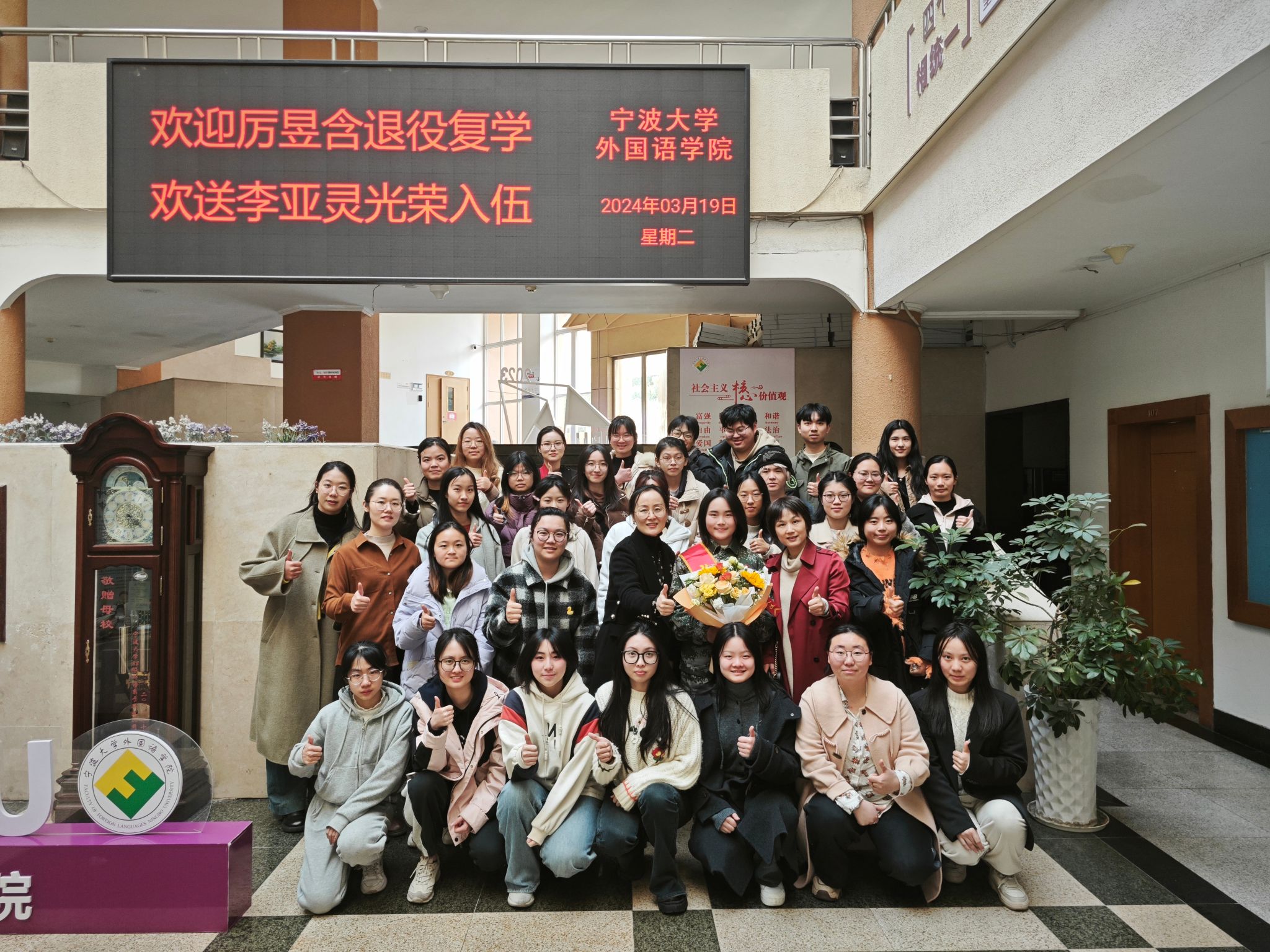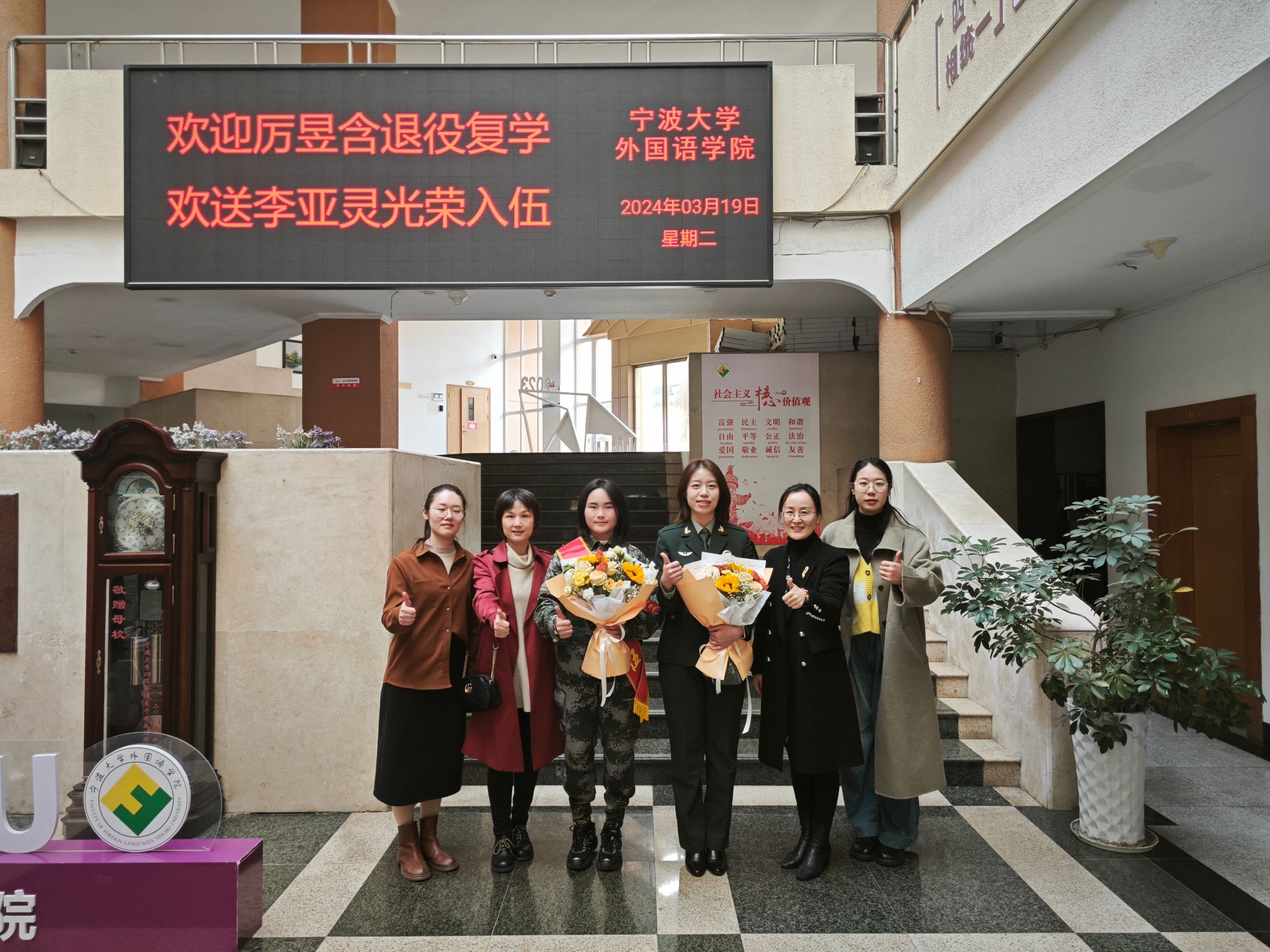 2019级英语专业厉昱含结束两年军旅生活,重返校园。在欢迎会上,她一身戎装、英姿飒爽,向大家生动介绍了自己在部队的难忘经历和收获,并为即将入伍的新兵李亚灵同学分享了宝贵经验,希望她能早日成为一名政治合格、军事过硬、作风优良、纪律严明的新时代军人。2022级英语师范专业的李亚灵作为即将入伍的新兵,分享了自己从小以来的军旅梦和为此追求奋斗的历程,并表达了对班主任和班级全体同学的真挚感谢和祝福。