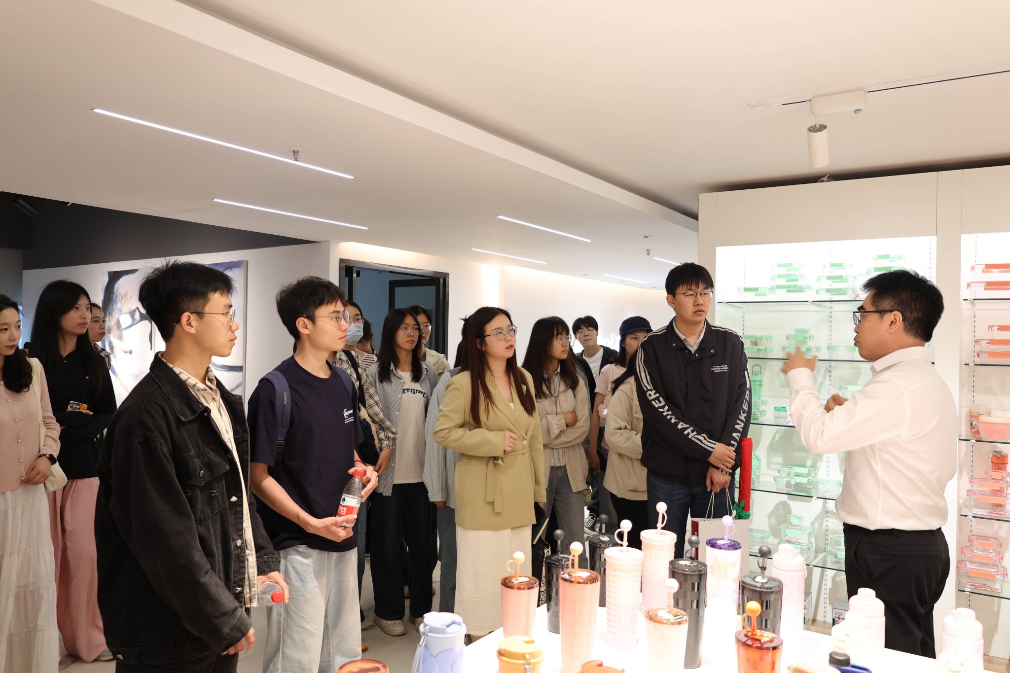 随后,师生们在胡静波主管和徐朝儿主管的带领下,参观了公司的注塑生产车间和装配生产车间,了解了公司严格的生产流程和质量检测标准。接着,师生们在王波总监的带领下,来到公司产品样板间参观,一一详细介绍产品创新点和优势,同学们也被各种脑洞大开的设计所惊奇,利时集团荣誉墙上“制造业单项冠军”“国家绿色工厂”“浙江省5G全连接工厂(工厂级)”“宁波市人民政府质量奖”等诸多荣誉,和专利墙上的上百项专利,更让师生们印象深刻,对利时集团的底蕴和创新特色也有了更深了解。