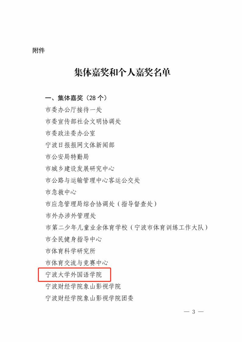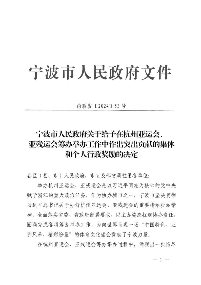 6月29日,宁波市人民政府发布《关于给予在杭州亚运会、亚残运会筹办举办工作中作出突出贡献的集体和个人行政奖励的决定》,对在杭州亚运会、亚残运会筹办举办过程中涌现出的恪尽职守、无私奉献的28个集体和84名个人给予嘉奖。91porny