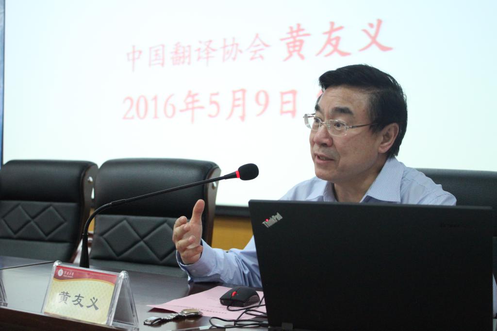 在谈及如何译好各类文体的翻译策略时,黄友义提出了分门别类、不同处理的总体原则。如翻译党政文献需要以忠实原文为主,翻译新闻报道则要以让人看得懂、听得明为主,而书名、画册等的翻译则要讲求吸引人,文学小说的翻译难度最大,最理想的模式是通过中外译者合作的方式传递原作的神韵和确保译作的道地。讲座的最后,黄友义总结认为中译外没有捷径可走,译者翻译的不是文字而是文化,真正的翻译是促成有效的跨文化交流。